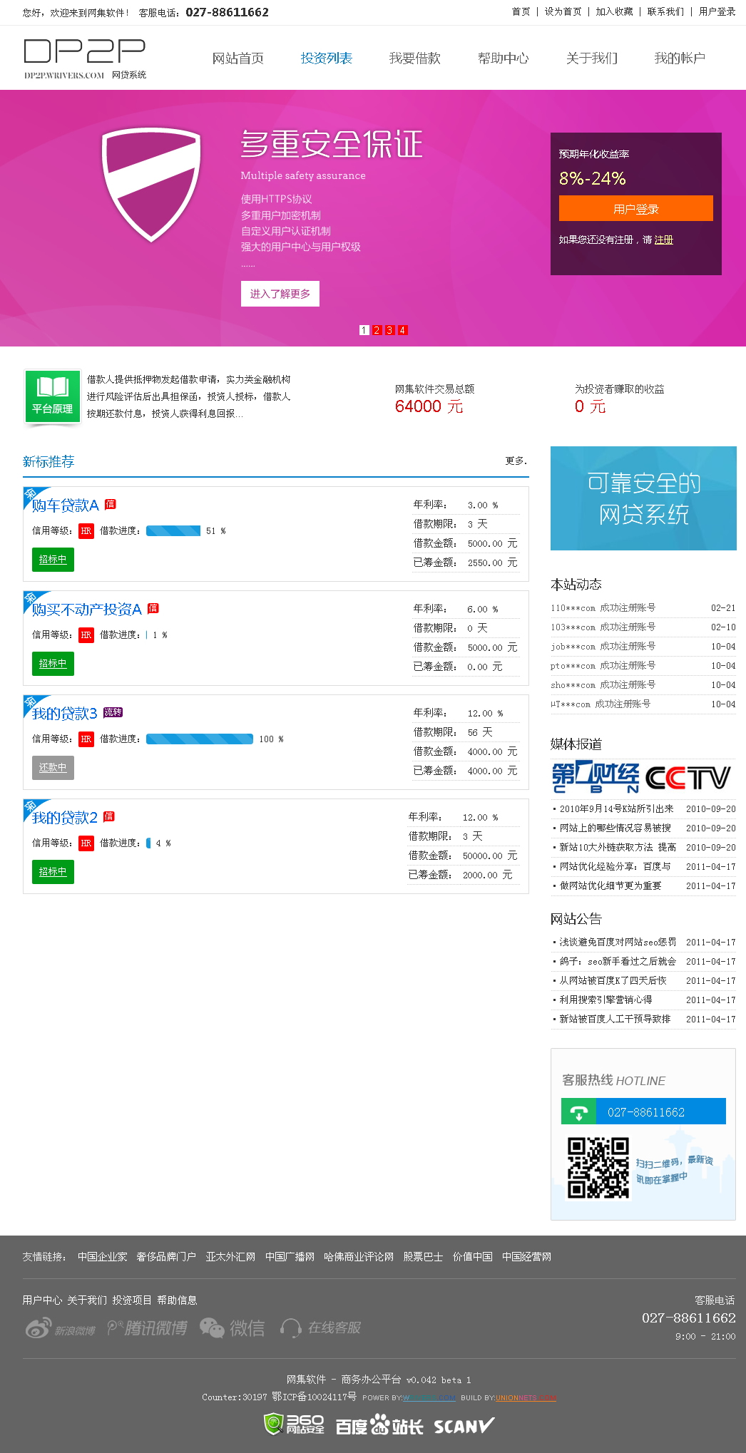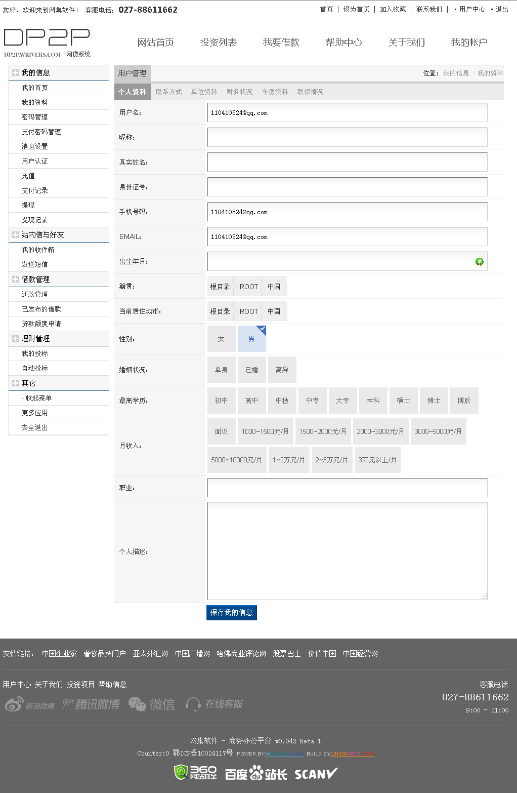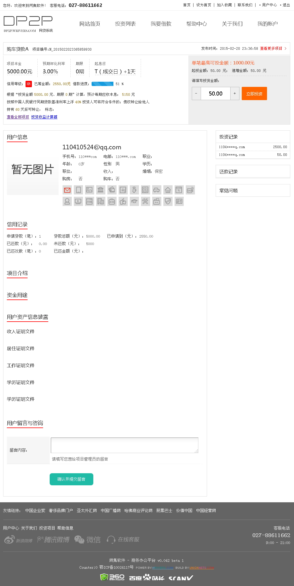 | 投资项目情况展示 | 投资项目详细情况的展示:项目名称、项目信用等级、项目状态、项目标的总额、项目年利率、项目进度等等 |