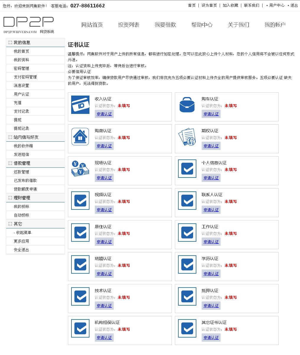 | 用户认证 | 用户电子邮件审核、手机审核、头像审核、银行审核、支付方式审核、身份证审核、信用审核、收入审核、购车审核、购房审核、期权审核、现场审核、个人信息审核、视频审核、联系人审核、居住审核、工作审核、结婚审核、学历审核、技术审核、抵押审核、机构担保审核、其它证书审核 |