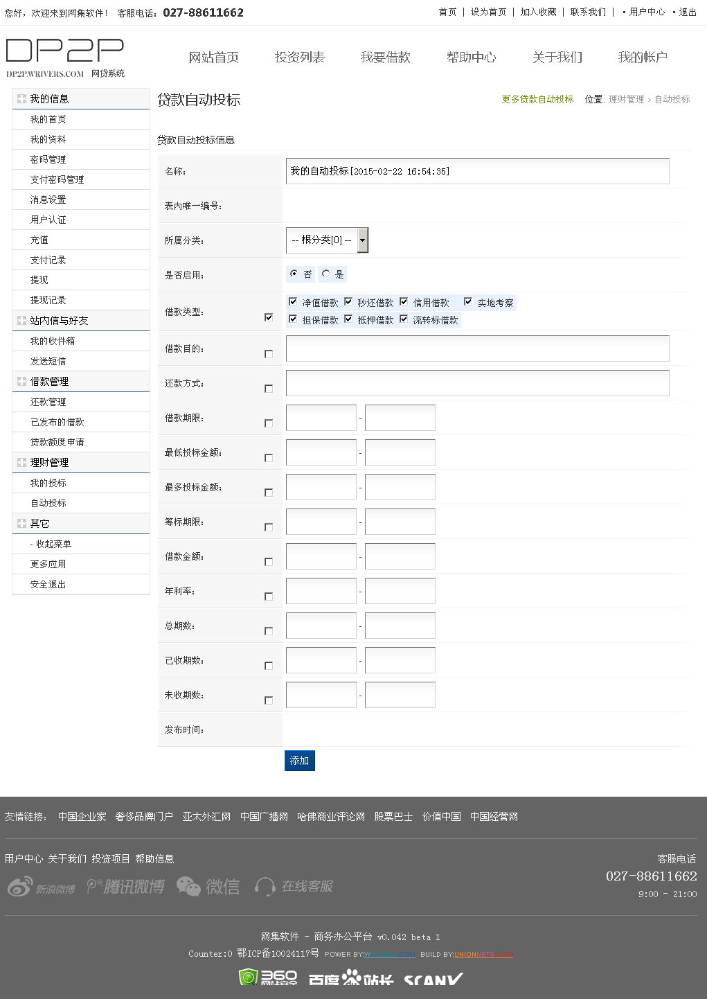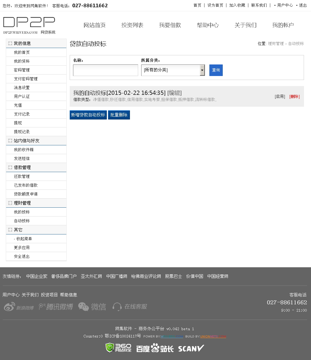 | 自动投标管理[专] | 用户设置的自动投资 |
